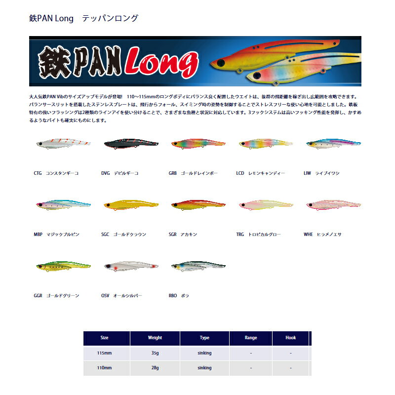 鉄PAN Long テッパンロング 大人気鉄PAN Vibのサイズアップモデルが登場! 110〜115mmのロングボディにバランス良く配置したウエイトは、抜群の飛距離を稼ぎ出し広範囲を攻略できます。